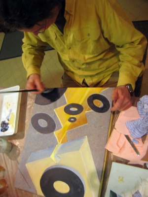 Essais tout d'abord à la gouache, qui sera facile à enlever. Elle craquele d'ailleurs presque aussitot. |