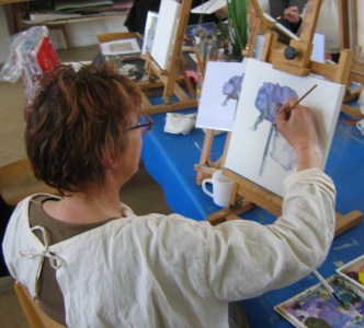 (ci-contre, gauche) Sylvie se livre avec fougue à d'épiques batailles avec ses pinceaux. Elle est visiblement passionnée. Toute entière à son aventure picturale du moment, le temps suspend son vol, dans le parc du château d'Aveny (voir la peinture du pont d'aveny)