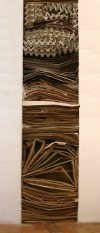 Cette série est accompagnée d’une installation constituée de petits dromadaires obtenus par simple découpage de boîtes à oeufs. Ces modules rigolos, sortes de marqueurs identitaires, renvoient à mon premier travail et participent à son épuisement. Erosion artificielle obtenue, ici encore, par la répétition d’un geste. L’accumulation de ces modules est plutôt un travail rébarbatif mais néanmoins nécessaire au jeu qui m’amuse : jeu de composition utilisant les rapports créés entre les différents éléments et l’espace qui les contient. |
