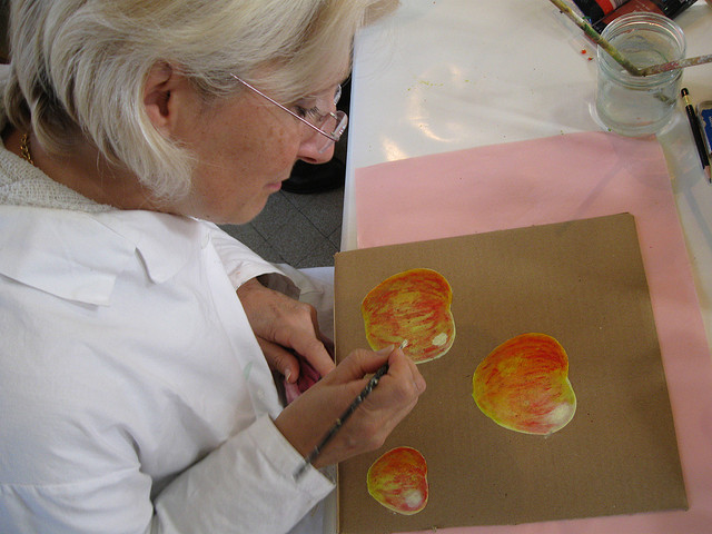 par Acrylique sur toile 55 x 46 cm Madame Cézanne coupant, pêlant une pomme ! Le papier peint olivâtre du fond