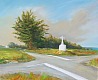 Du 1 au 18 juillet 2004, nous étions à Tibain, commune de Locmaria. Au contraire de l'année dernière, où ma palette se satura de bleu presque méditérranéen, cette année plutôt grisaille, bruine, vent... j'ai quand même pas mal travaillé sous le parapluie, aux bord des routes, et mon point de chute favori, vers les 19h, était le café et l'église de Locmaria, celle-ci très insolite avec son palmier, son toit en poivrière, son ambiance espagnole ! Les touristes planqués dans leurs logis, je rencontre avec plaisir les vrais belle-ilois, en vélo, à pied, à cheval... et aux comptoirs... |