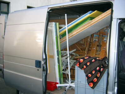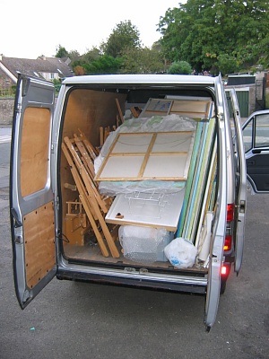 Je suis assez content de cette exp�rience, rendue possible par l'assistance d�sint�ress�e de Pascal Cambourg, directeur de la concession Citro�n de Gisors (transport de mes peintures et chevalets). Si je n'avais pas eu cette aide inesp�r�e, j'aurais du faire au moins trois ou quatre voyages avec ma voiture. (voir chargement folklorique en Septembre) |