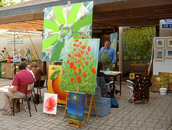 Au fond, juste � cot� de l'entr�e principale de la Maison de l'Ile ou se tenait un march� artisanal, je peins un grand tableau de pommes 1,50 x 1,50 m. Ce panneau est en fait au d�part une surface d'entra�nement pour mes �l�ves de l'�cole du Pommier. |