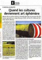 Château-sur-Epte Quand les cultures deviennent art éphémère Mettre de la couleur dans le monde agricole en portant des éléments agricoles au rang d’œuvre d’art, tel est le credo de l’artiste Pierre Marcel. Pierre marcel est un artiste de l’art éphémère ou pas. Il aime à se qualifier d’artiste Normand et Francilien. Il a souhaité marquer à sa manière les 1100 ans de la création de la Normandie. Il a donc installé des étoffes de tissus autour de ballots de paille dans des champs qui se trouvent aux abords de la N14, route qui va de Paris à Rouen. ‘’Je fais un travail sur le pont symbolique entre la Normandie et l’Ile de France’’, explique l’artiste. La perspective que voient les automobilistes est surprenante, colorée et plus d’un s’arrête un court instant ou un plus long moment pour contempler ce qui surprend voire dérange, mais ne laisse en aucun cas indifférent. ‘’Je voulais mettre de la couleur dans cette Normandie et installer les toiles sur les ballots de paille. Ils sont si précieux, jolis et donnent de la couleur aux paysages. J’ai choisi les couleurs de la Normandie, mais pas uniquement. Je voulais donner de la bonne humeur à notre région. J’ai aussi invité des groupes de jeunes qui sont venus marcher dans la chaume et parler aux agriculteurs. Ces jeunes étaient environ une centaine. Les agriculteurs ont accepté le land art’’, explique Pierre Marcel. Cette Initiative artistique de Pierre marcel et de ses amis de l’association de l’Atelier du Pommier a eu pour objectif de célébrer joyeusement la création de la Normandie, d’entretenir des relations positives et amicales avec le monde agricole local et de donner à la fonction d’artiste une valeur sympathique auprès du public. Une réussite ! Légendes |