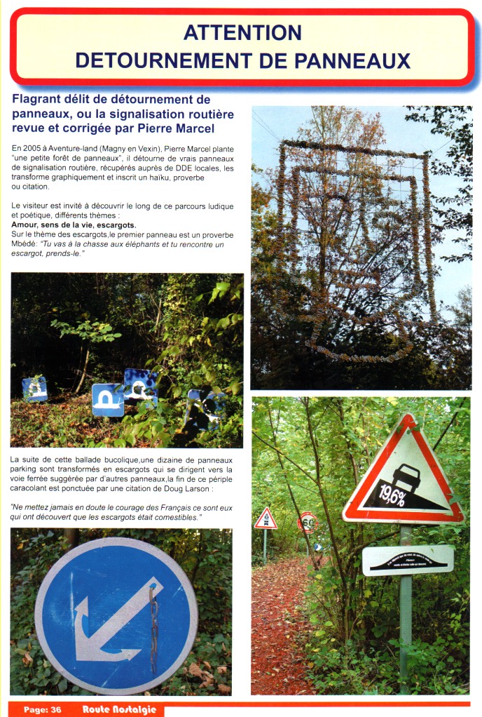 ROUTE NOSTALGIE , Janvier 2007, numéro 15 ATTENTION DETOURNEMENT DE PANNEAUX Flagrand délit de détournement de panneaux, ou la signalisation routière revue et corrigée par Pierre Marcel Texte Geneviève TISON-CUVELLIER Photos Jean-Patrice SUIRE http://routenostalgie.free.fr/numeros/couvn15.htm Voir ci-dessous reportage réalisé par le magasine Route Nostalgie sur l'exposition panneaux détournés Pierre Marcel à l'occasion de l'édition 2005 de Art'hieul. Le document PDF communiqué par Route Nostalgie est de meilleure qualité que les pages html ci-dessous. Cliquer ici pour le consulter. |