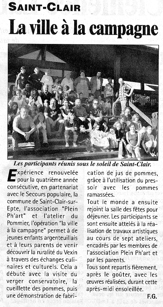 Le Vexin français Vallée de l’Oise Page 28 – Saint-Clair La ville à la campagne Expérience renouvelée pour la quatrième année consécutive, en partenariat avec le Secours populaire, la commune de Saint-Clair-sur-Epte, l’association « Plein Ph’Art » et l’atelier du Pommier, l’opération « la ville à la campagne » permet à de jeunes enfants argenteuillais et à leurs parents de venir découvrir la ruralité du Vexin à travers des échanges culinaires et culturels. Cela a débuté avec la visite du verger conservatoire, la cueillette des pommes, puis une démonstration de fabrication de jus de pommes, grâce à l’utilisation du pressoir avec les pommes ramassées. Tout le monde a ensuite rejoint la salle des fêtes pour déjeuner. Les participants se sont ensuite attelés à la réalisation de travaux artistiques au cours de sept ateliers, encadrés par les membres de l’association Plein Ph’Art et par les parents. Tous sont repartis fièrement, après le goûter, avec les œuvres réalisées, durant cette après-midi ensoleillée. F.G