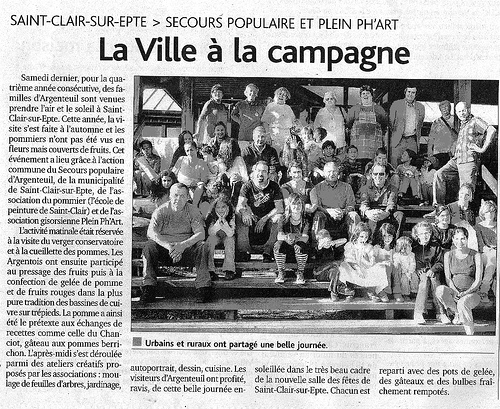 Chacun pourrait camper sur ses positions, avoir des idées arrêtées et négatives sur celui qu’il ne connaît pas. La rencontre annuelle basée à Saint-Clair-sur-Epte intitulée « la ville à la campagne » est destinée à chasser tout a priori. Les Saint Clairois, villageois résidant à la limite de Val d’Oise, accueillaient samedi l’autre extrémité du département, cinquante Argenteuillais, pour une journée de partage. Cette année, retour à la case prieuré après une rencontre dans la salle des fêtes l’an passé. Côté campagne, le verger en fleurs, la cidrerie et ses odeurs mémorables, une démonstration de greffage a apporté une ouverture nouvelle sur le monde rural. Côté ville, la découverte s’est produite au niveau gustatif avec des pâtisseries orientales succulentes accompagnées d’un thé à la menthe parfumé. Les enfants ont été invités à réaliser des œuvres graphiques qu’ils ont pu ramener chez eux. Nul doute que cette troisième édition fut une réussite. « On avait peur que l’idée soit trop fleur bleue, trop idéaliste » commente Pierre Marcel, adhérent des associations Plein ph’Art et A Propos d’Art, oeuvrant pour le succès de la journée. Un succès qui ne doit rien au hasard puisque pas moins de six partenaires ont agi dans le même sens. Le secours populaire français d’Argenteuil a réuni les familles, financé le voyage et le pique-nique des participants. La commune de Saint Clair sur Epte a offert ses locaux, financé les fournitures des différents ateliers et animé la visite pomologique.