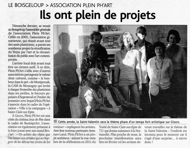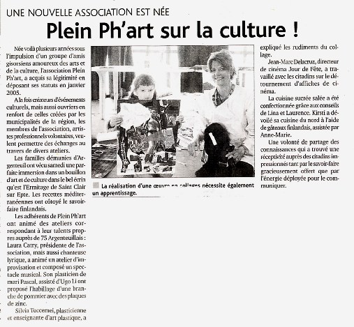 (...) l'association Plein Ph'art, active depuis quelques mois à Gisors, entend profiter de la foire à tout pour aller à la rencontre du public. Sur un stand rue de Vienne (de la librairie des templiers jusqu'à la boutique Foci), artistes et plasticiens utiliseront des objets hétéroclites devenus inutiles, qui seront assemblés, torturés et détournés de leur usage habituel. Ces objets chargés d'humour seront vendus sur le stand. Pierre Marcel, Pascal Catry (et Bernard Pellet NDL) feront partie de ces artistes créateurs d'objets clin d'œil, qui porteront leur signature. De son côté, Sylvie créera sur place deux grandes fresques avec la participation des promeneurs. Pour l'association Plein Ph'art ce sera aussi l'occasion de présenter ses projets à de nouveaux adhérents. A ce sujet, le site Internet est d'ores et déjà ouvert (pleinphart.com) (...) |