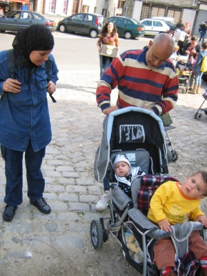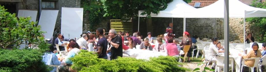 Fred, un volontaire trés volontaire du Secours Populaire, toujours sourires et pleine forme, installe les tables du déjeuner. |